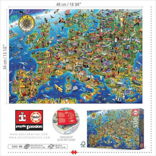 Puzzle de 500 piezas en el que se muestra el mapa de Europa con banderas, monumentos y atracciones, incluso algunos de los animales más característicos que los habitan. De esta forma, los niños aprenden a la vez que juegan, desarrollando la capacidad de concentración y memoria visual.Medida del puzzle montado: 480x340mmEdad recomendada: a partir de 10 años.