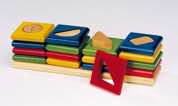 16 piezas de madera natural teñida de colores para encajar en una base de madera, según la forma. Medidas: 24,5 x 5 x 6 cm.