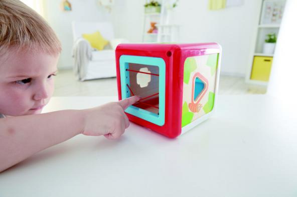 Este colorido cubo de clasificación de formas y colores enseña a los peques a reconocer las formas de las criaturas del jardín. Deberán introducir las figuras en sus agujeros correspondientes.