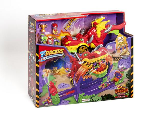 Increíble playset de la colección T-Racers 2. Con esta alucinante pista de juego los más pequeños podrán pasar horas y horas de diversión, tratando de derrotar al temible dragón lanzando sus coches por el looping. ¡Pero cuidado! El dragón tratará de engullir a cualquiera que no pase la prueba de velocidad de acrobacia. Aprieta el lanzador con la potencia precisa para que Tiki Twist sortee al poderoso Dragón, consiga hacer el loop completo ¡y gane la copa! Si no calculas tu fuerza con precisión. ¡te atrapará entre sus terroríficos dientes! Edad recomendada: a partir de 3 años.